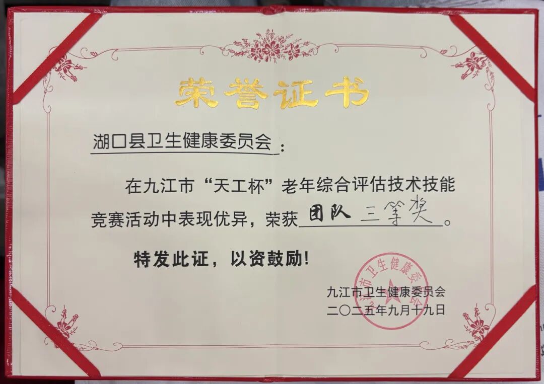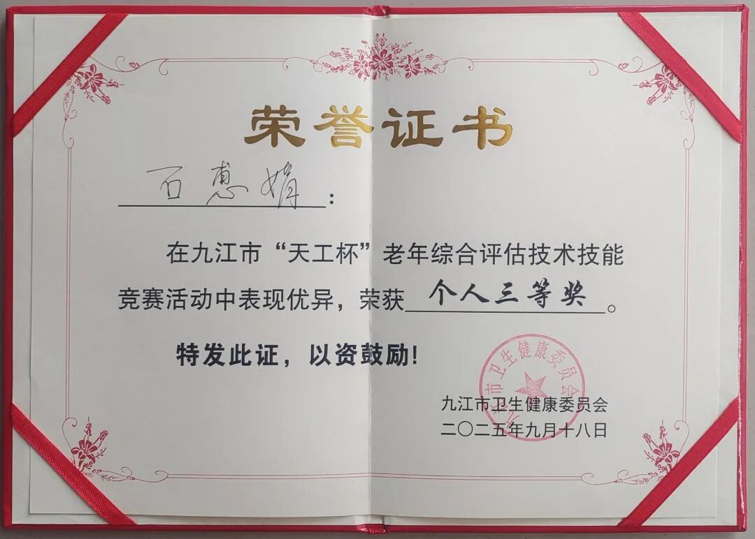 刚刚,在今天下午落幕的2025年九江市“天工杯”老年综合评估技术技能竞赛中,湖口县总医院中医医院院区选派的护士石惠娟、医师沈鹏英,与兄弟院区队友一起,代表湖口县卫生健康委员会夺得团体三等奖。同时,石惠娟还喜获个人三等奖。